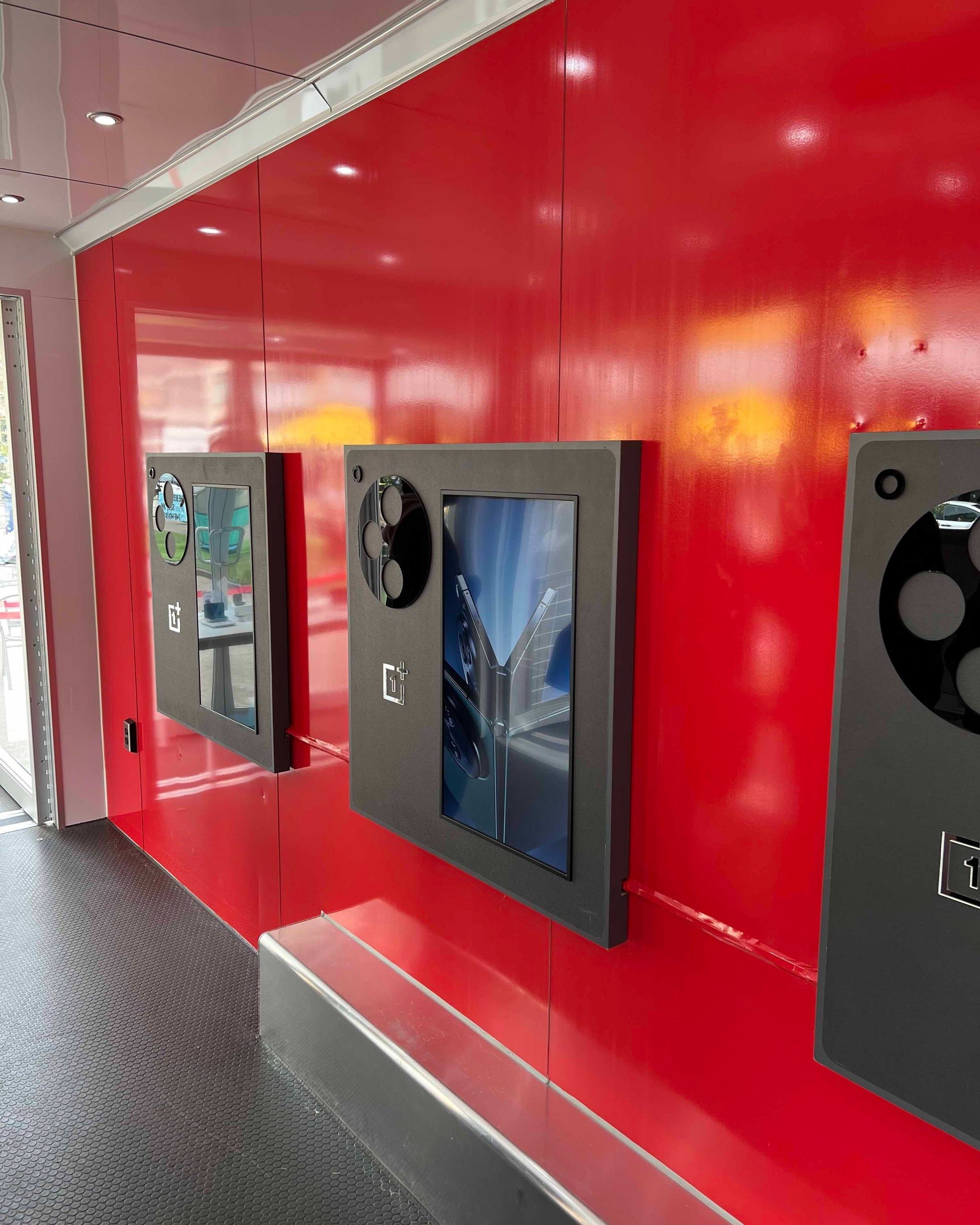 The interior of the trailer includes a 65″ touch screen in the front, two 55″ Samsung FLIP touch displays on the side and a beautiful dual-sided OLED display in the window for both inside and outside presentation of content.